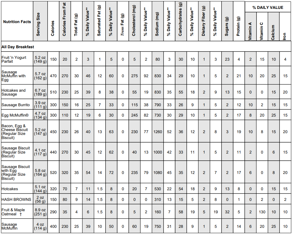 | Egg McMuffin® | 4.7 oz (134g) | 300 | 12 | 6 | 730 | 2 | 3 | 17 |